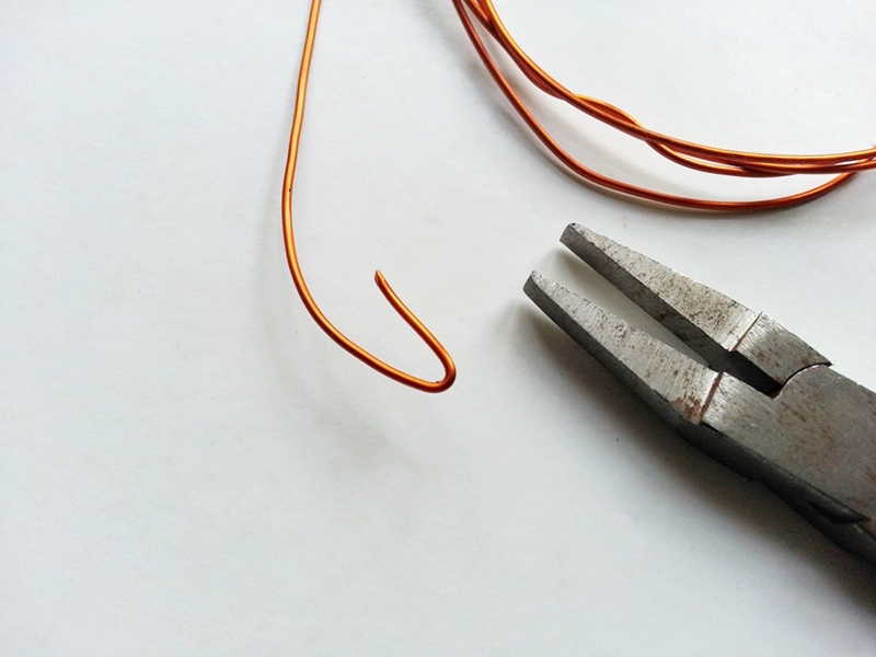 Continue the wire to bend upwards but slightly bend the wire midway and then create the tip of the leaf (Use flat nose pliers to create the perfect tip). Then bend the wire downwards to complete the leaf, again slightly bend the wire midway.