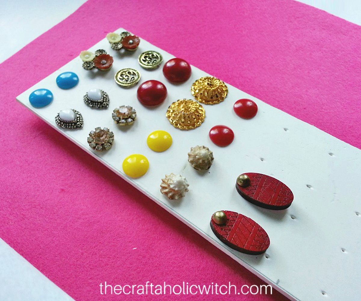 Simply insert your stud earrings through the holes made on the foam board. Secure the earrings by attaching their backs at the back side of the foam board. This way you’ll find all your stud earrings at one place and you’ll hardly lose any.