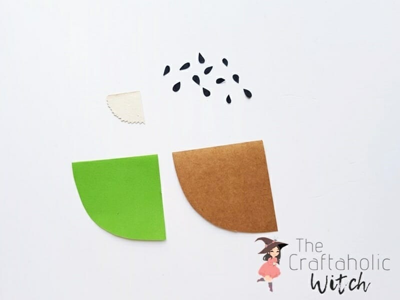 Take the small teardrop cutouts (seeds) and attach them on the green part, around the curved border of the off-white part. Overlap a few seeds with the off-white part as well.