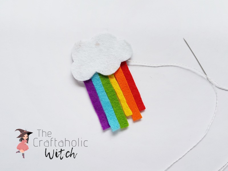 Place any one of the cloud patterns on a flat surface and then place the rainbow stripes aligned noon either wider side of the cloud pattern. Stich or glue the rainbow stripes with the cloud on that part. Then place the other cloud pattern on the top of the rainbow attached cloud pattern. Prepare needle with white thread. Oh, but before that, let’s prepare the Kawaii eyes and blushes!