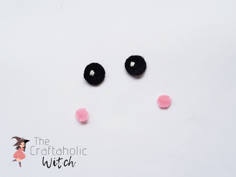 Simply cut out 2 small circles from light pink coloured felt and 2 relatively big circles from black coloured felt. I stitched small white circles on the eye cutouts to give the eyes a cuter and more Kawaii look!