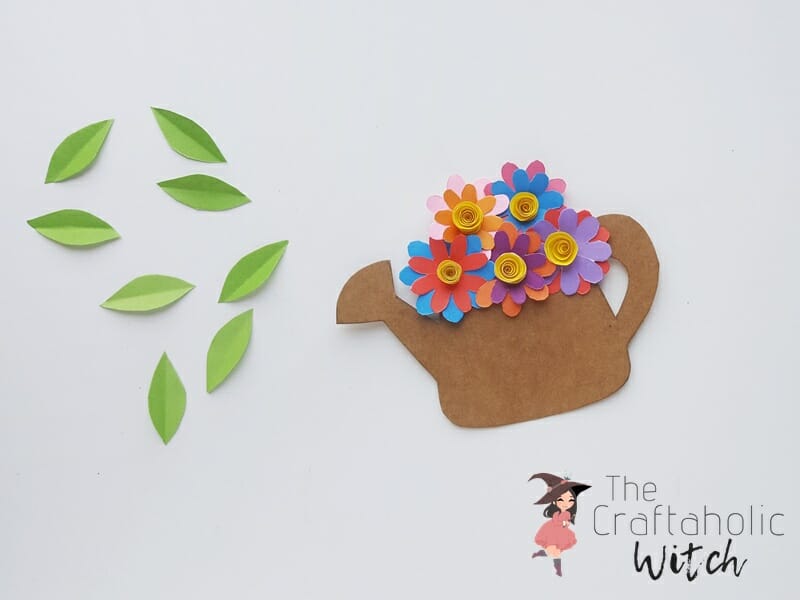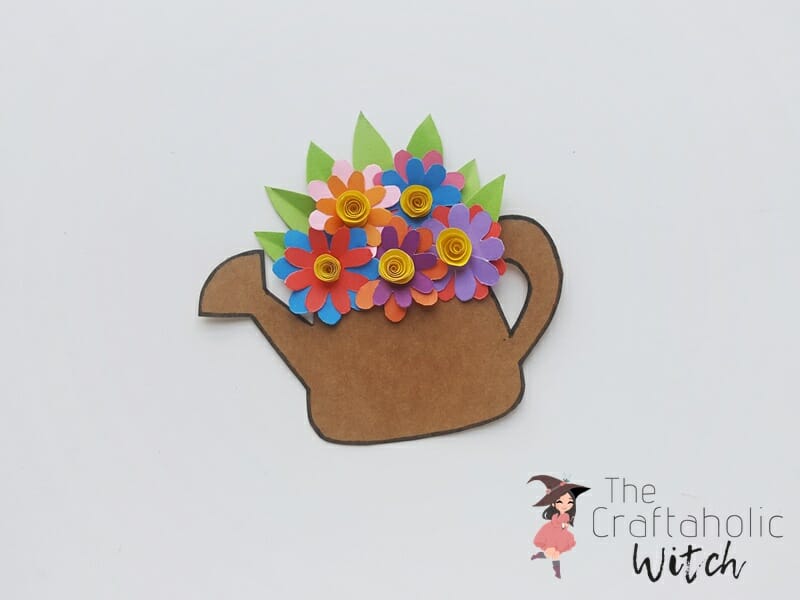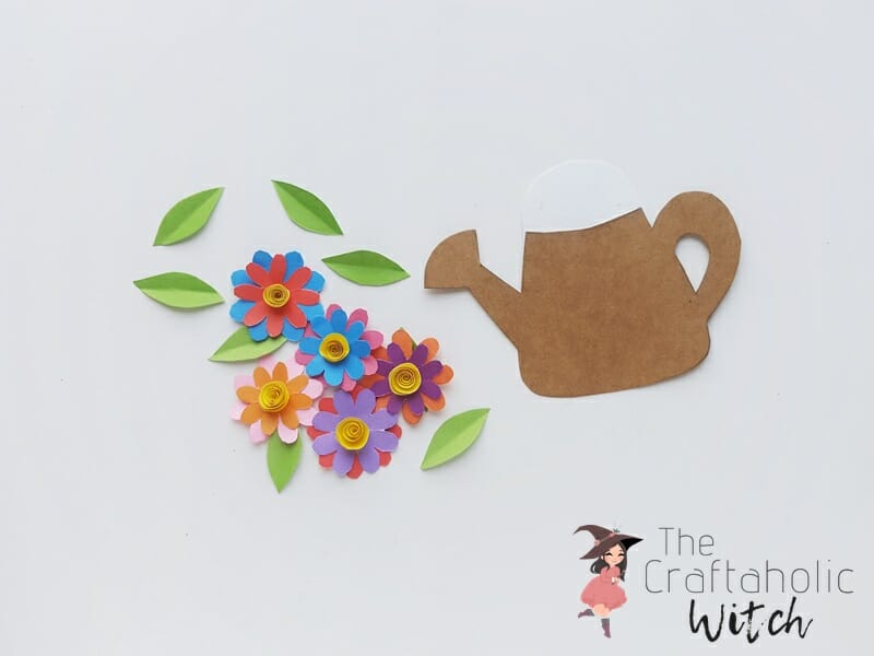 Roll the spiral patterns to create rolled flowers. Stick 2 flower cutouts together, crisscross wise. Glue the rolled flower on the center of the 2 attached flowers. Also, fold the leaf patterns to create crease along the middle line (lengthwise). Attach the semi circular pattern on teh top side of the watering can, keep it attached on the back side.