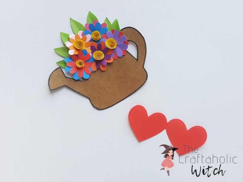 Attach any one of the hearts on the center of the watering can and keeping the other heart free. Fold the double heart along the line between them to form the heart card. Write down your message inside the card.