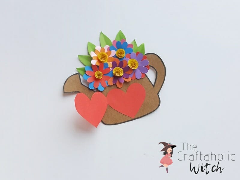 Select different colored craft papers for the flowers. Use colored craft papers for the double heart pattern, flowers and leaves. Use cardstock paper for the watering can pattern. Trace the template patterns on the selected papers and cut them out nicely.