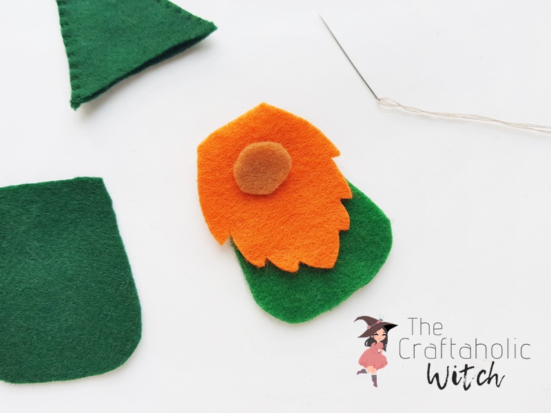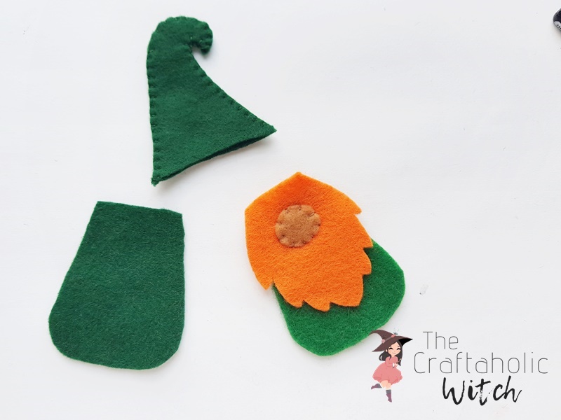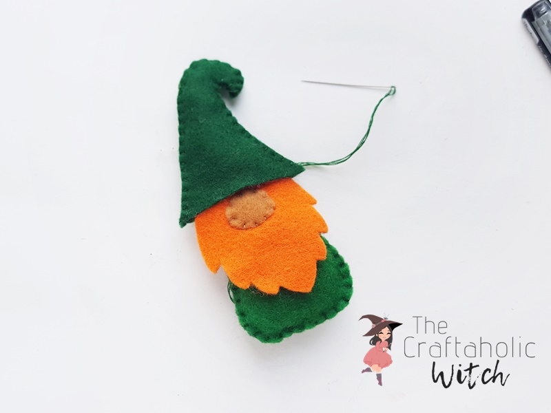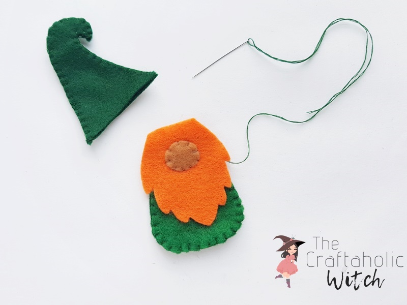 Insert the hat through the top end of the felt gnome pattern. Overlap about a cm of the hat along the top end of the felt gnome.