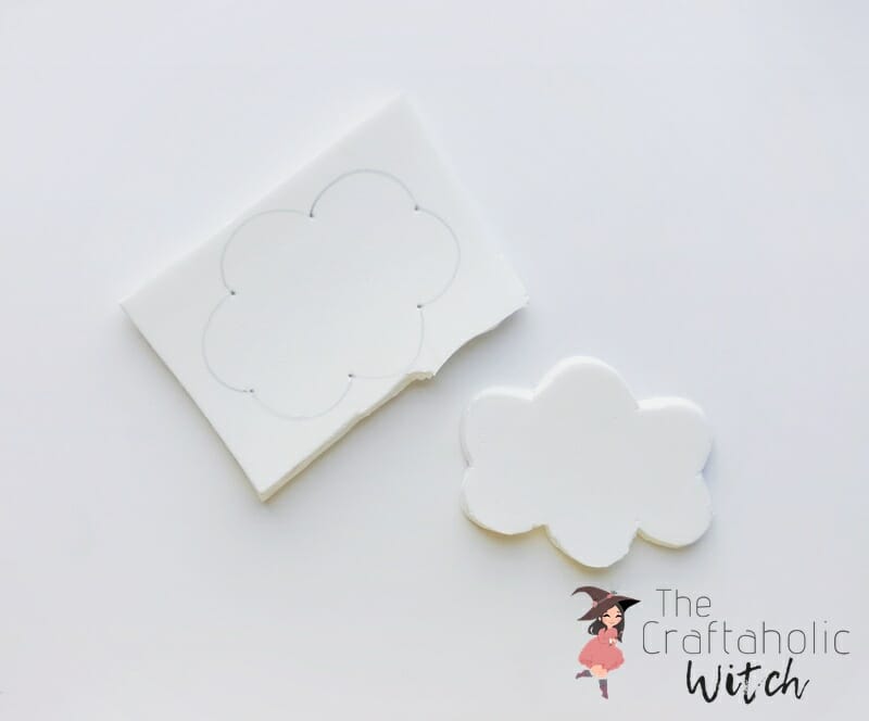 You can use white cardstock paper, white felt, or any white-colored soft material that is easy to cut. But I’m using a white craft foam sheet. Craft foam sheets are so easy to cut and gives the clouds a nicer look. Trace the cloud pattern (you can find the pattern in the given template) on a piece of craft foam; use a pencil to trace the pattern and scissors to cut out the traced cloud patterns. You will need 2 clouds for this craft.