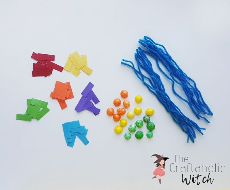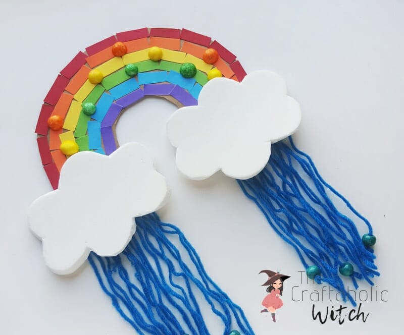 Select rainbow colors from the colored craft papers. Trace the small rectangle shape from the template on the selected craft papers and cut them out using scissors. Determine the length you want for the main part and cut out some yarn strands as determined. Use any shade of blue for the rain. Grab some colored styrofoam balls and cut them in half or you can also use small pompoms.
