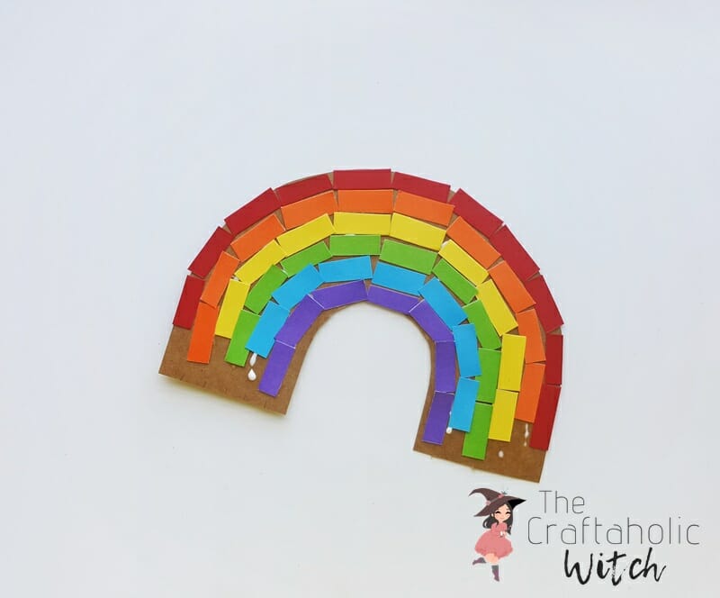 Continue to glue the colored paper cutouts until the whole rainbow base is filled. Keep in mind to keep the correct sequence of rainbow colors while gluing the paper cut-outs on the rainbow base.